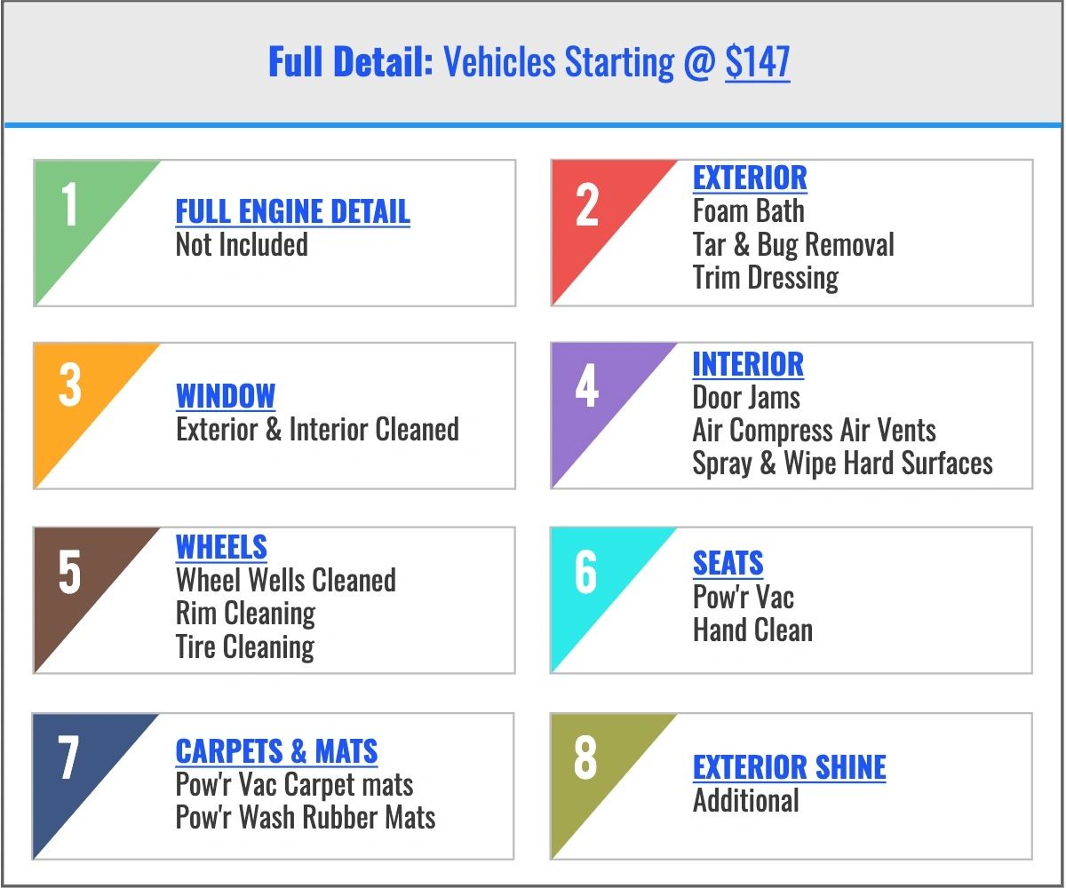 Full-scale 'On-Site' Exterior and Interior cleaning of your vehicle. The Ultimate Detailing Service of Exterior Washing, Ceramic Application, Rim & Tire Detail, Apply Dressing on Trim (Interior & Exterior), Steam clean / shampoo / leather cleaning, fabric protector, stain removal, and deodorization.
